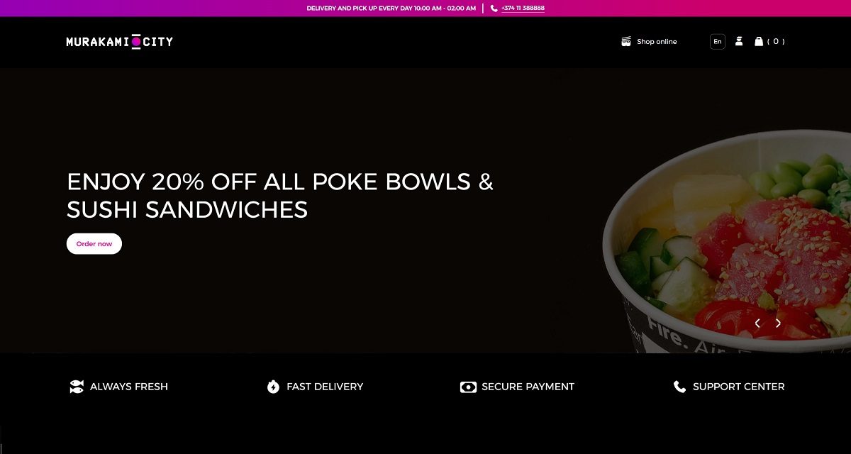 Murakami City operates an online platform for ordering Japanese food — primarily sushi and poke bowls — with delivery across Yerevan and nearby areas. Their website uses a clean, functional e-commerce design: a streamlined UI/UX, clear navigation, bold food photography and a smooth ordering flow that makes browsing the menu and placing orders intuitive and efficient.