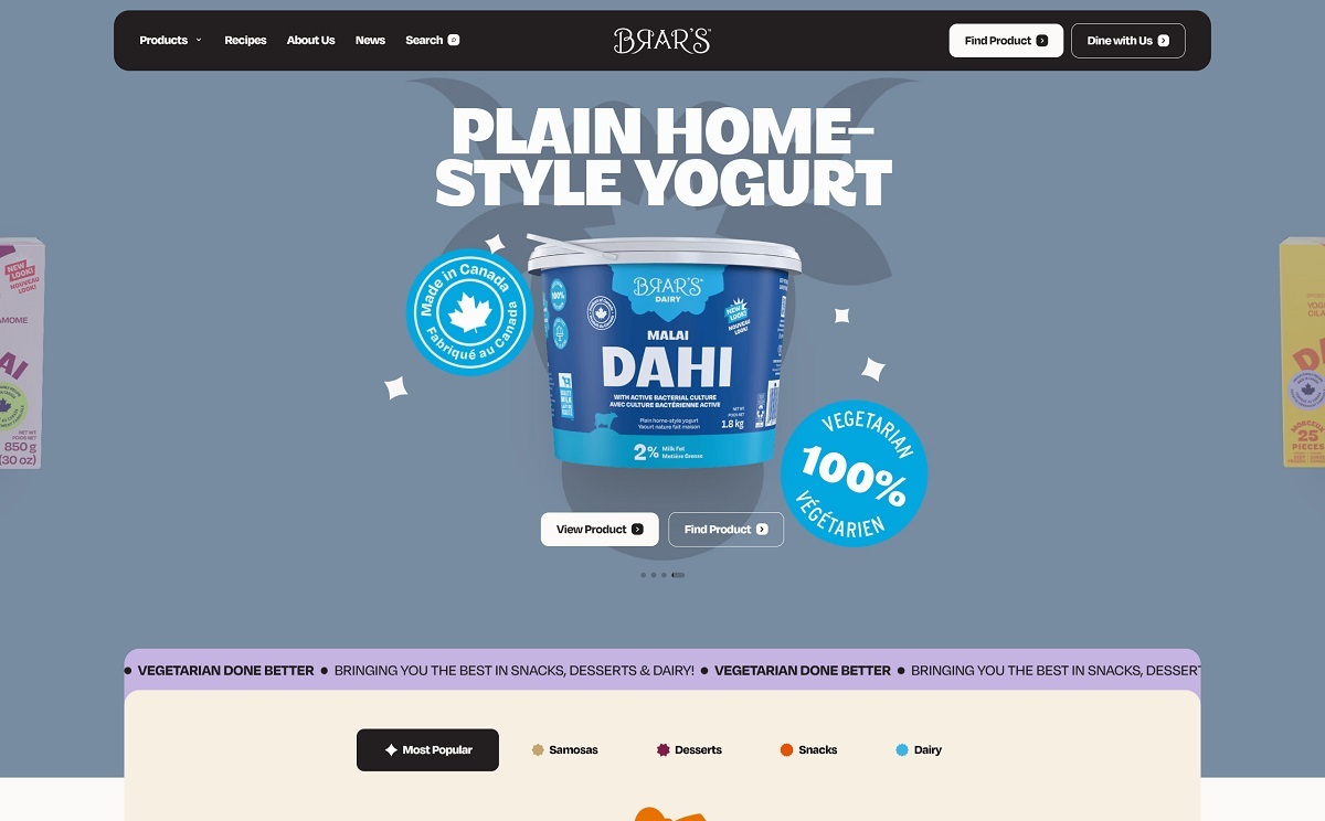 Brar’s website presents a warm, approachable design with rich visuals of family-style meals and Indian-vegetarian products, paired with clear, easy navigation. Their product lineup centers on authentic Indian vegetarian foods—such as paneer, ghee, snacks, sweets and frozen treats—highlighting heritage, quality and dietary-friendly labels like gluten-free or vegan. The site emphasizes community, tradition and transparency to frame their offerings as trusted, home-style choices for modern consumers.