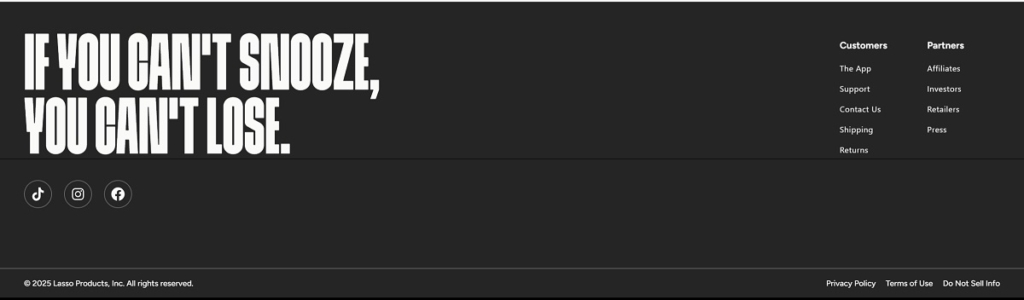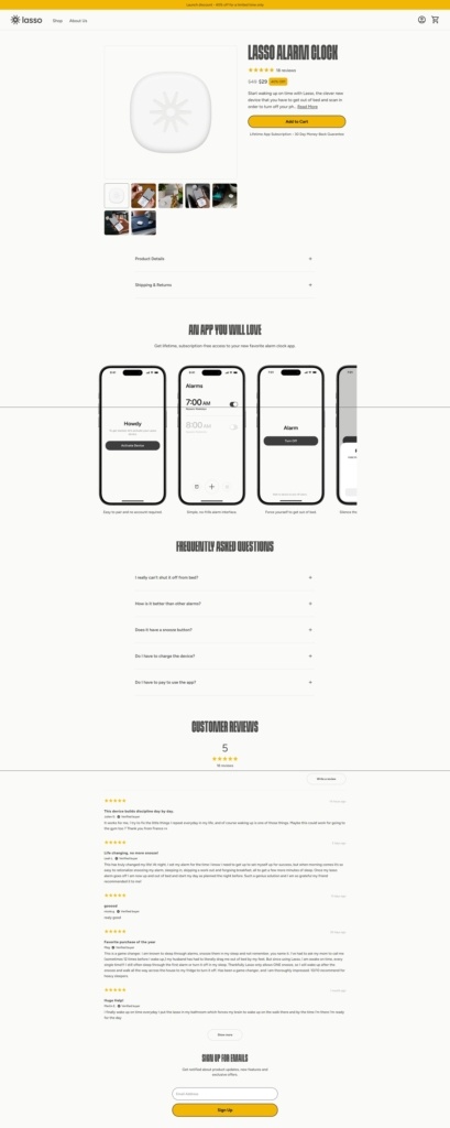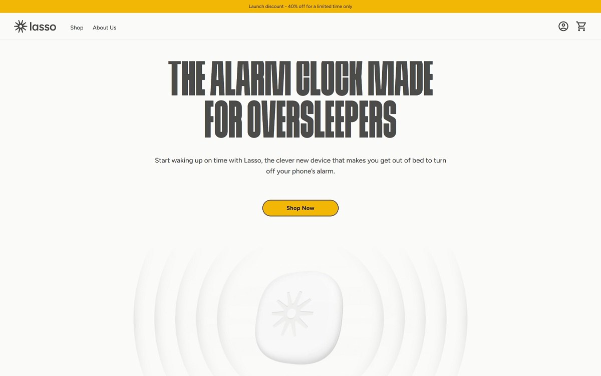 The website features a clean-and-modern design with strong visuals, simple navigation and a clear use-case message right up front. Their flagship product is a smart stand-alone device that distances your alarm from your bed — you must physically walk over and tap the device to turn off your phone’s alarm