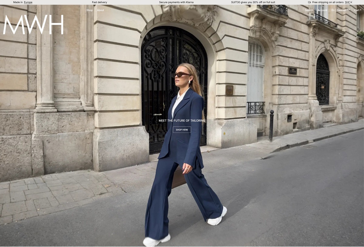 The website for MWH of Sweden combines Scandinavian minimalism with smart functionality — crisp white space, clean navigation, and bold hero visuals introduce the brand’s unique niche. Their product range focuses on tailored women’s businesswear that feels like activewear: suits, jackets, trousers, dresses designed with stretch fabrics and European craftsmanship.