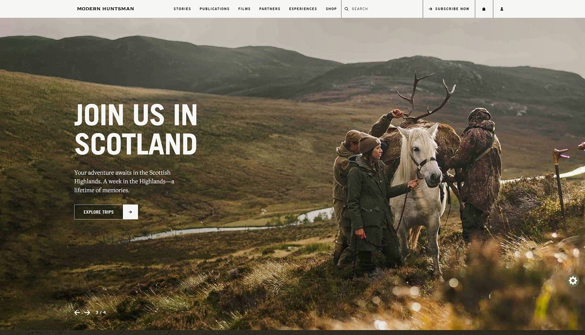 Modern Huntsman’s website merges storytelling and commerce in a refined, outdoor-lifestyle layout—think large hero images, elegant typography, and immersive narratives. Their product offerings include curated books, apparel, accessories, prints, and field-to-table experiences, all tied to a ethos of wilderness, craft, and connection.