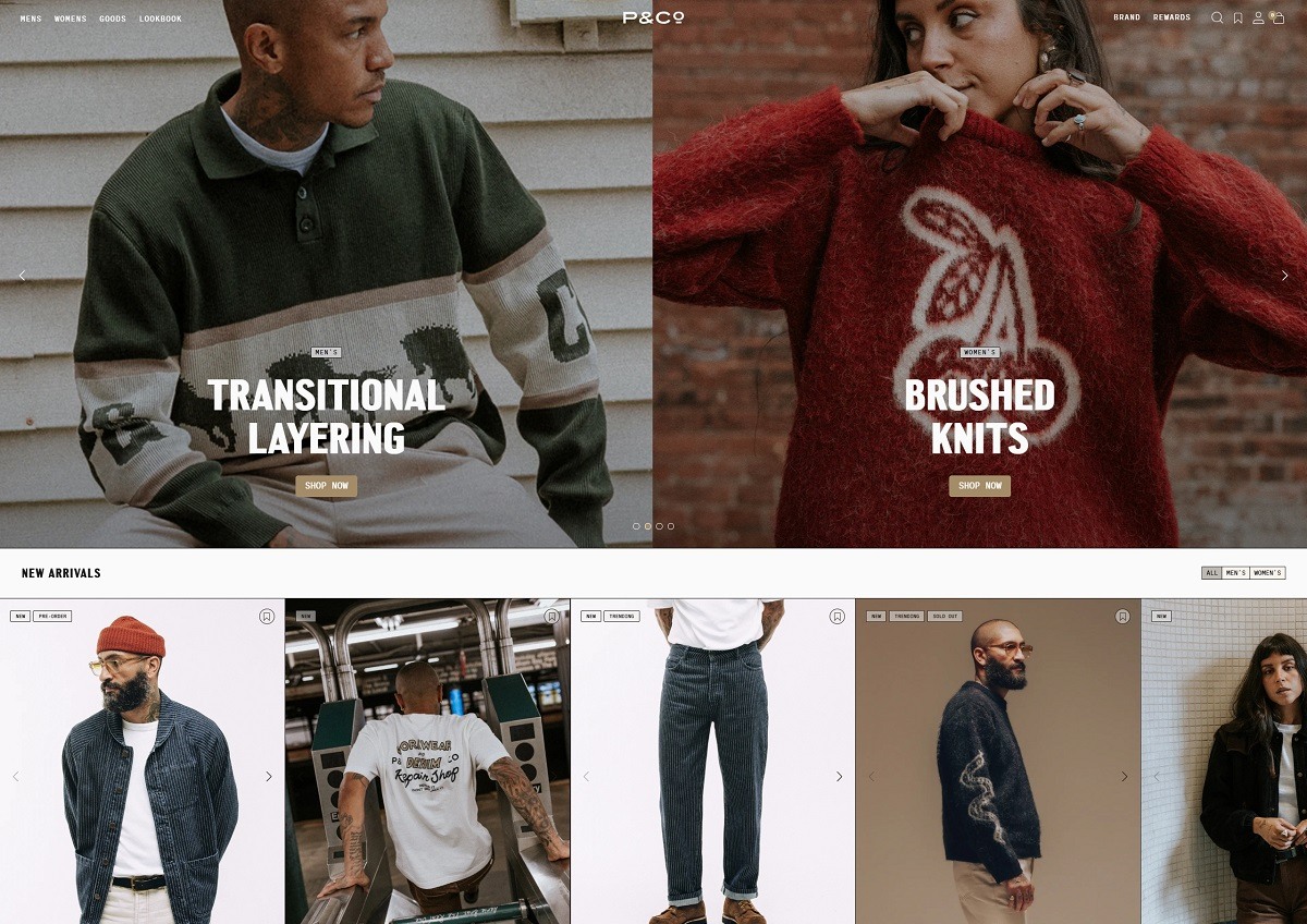 P&Co’s website blends rugged style with clean structure: bold hero visuals, crisp typography, and well-segmented categories for menswear, womenswear, and goods. Their product line includes curated streetwear staples — heavy-weight tees, outerwear, denim, knitwear, headwear, and leather goods — built with emphasis on craftsmanship and timeless design.