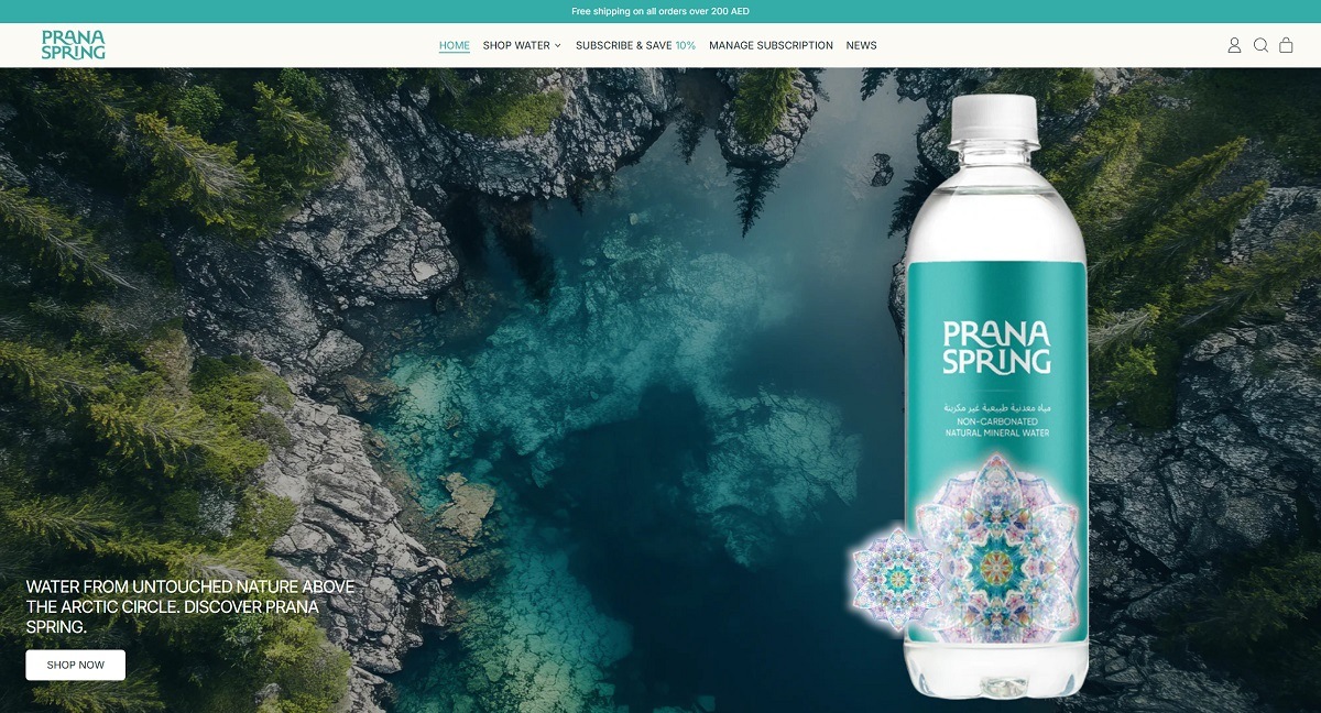 The website of PRANA Spring features a minimal, high-end design with fresh visuals, ample white space, and clean navigation that highlights purity and sustainability. Their product line is premium bottled water sourced from a glacier-tectonic well beyond the Arctic Circle, offered in still and sparkling variants with emphasis on ideal pH balance and ultra-low mineralization.