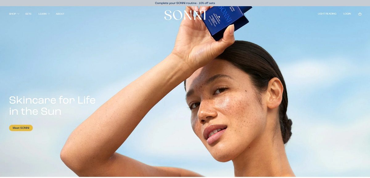 The SONNI website opens with bright, user-friendly aesthetics—ample white space, clear navigation, product carousels and bold calls-to-action. Their product offering centres around a dual-phase sun-care system: mineral-based SPF formulas like the “SunDay Mineral Serum SPF 50+” for day protection, and “SunDown” recovery items for evening skin repair.