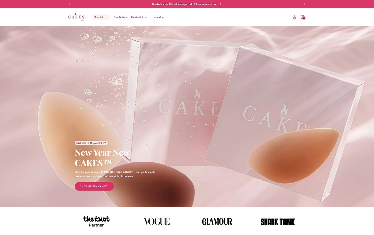 CAKES Body is a brand focused on reusable silicone nipple covers, including non-adhesive “Grippy” styles and adhesive “Sticky” styles, alongside bundles and related support pieces. The website design is bold and product-led, using oversized headlines, large lifestyle imagery, and category-driven navigation to move visitors quickly from the homepage into best sellers and shop collections.