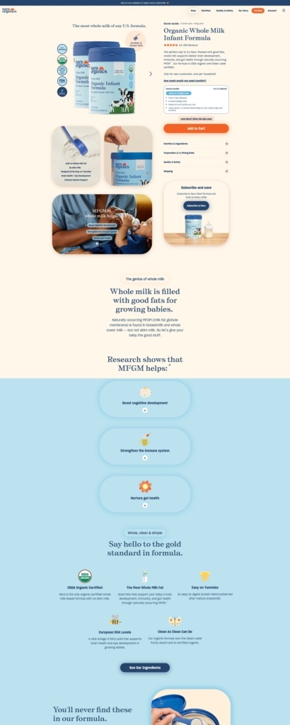Nara.com is the online home of Nara Organics, a brand selling organic infant formula and related baby nutrition products formulated with whole-food ingredients, healthy fats, and prebiotics to support early growth and development. The website uses a straightforward, wellness-focused design with clear navigation, strong product visuals, and benefit-oriented copy that explains nutritional features and subscription options for parents. Overall, the layout is functional and informative, aimed at helping caregivers understand product benefits and make purchases with confidence.