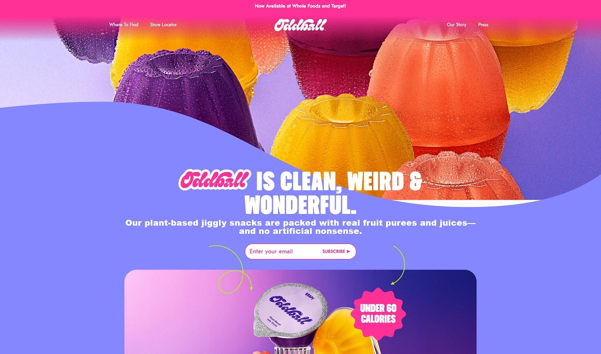 Oddball.world is an ecommerce site for Oddball, a “jiggly” fruit snack (a better-for-you Jell-O style cup) made from real fruit and agar, sold in flavours like Mango, Grapefruit, Double Berry, and Grape, plus multi-pack bundles. The website design is bold and modern, using big product photography, punchy headlines like “Break the Mold,” and quick paths to shop by flavour or find stores via a built-in store locator. It also leans on simple, icon-style ingredient claims (no artificial flavours or colours, real fruit purees and juices) to keep the page highly scannable