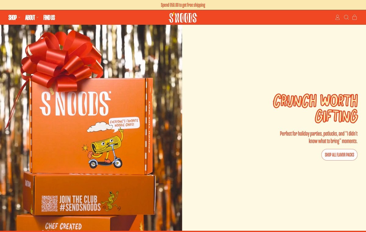 Eatsnoods.com is the ecommerce site for S’NOODS, a snack brand selling “noodle chips” in globally inspired flavours such as Spicy Miso Ramen, Rigatoni Basil Pomodoro, and Cavatappi Carbonara, alongside variety packs and seasonal drops. The website design is bold and playful, with large typography, punchy copy, and a simple top navigation that funnels quickly into Shop, About, and Find Us. It also supports retail discovery with a dedicated store locator while keeping the shopping experience clean and Shopify-native.