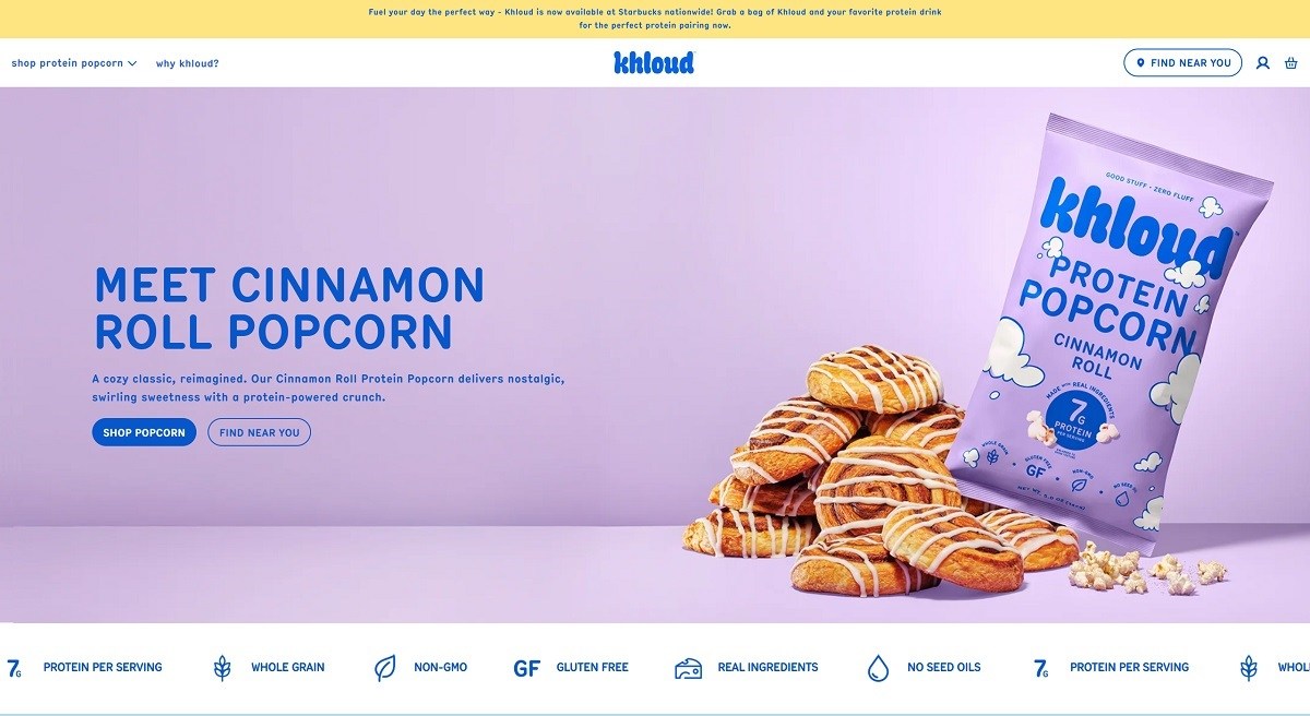 Khloudfoods.com is the storefront for Khloud (by Khloé Kardashian), selling protein popcorn in flavours like Cinnamon Roll, White Cheddar, Sweet & Salty Kettle Corn, and Olive Oil & Sea Salt, plus a variety pack and a “Subscribe & Save” option. The product is positioned around “real ingredients,” “no seed oils,” and 7g of complete protein per serving (using milk protein isolate). The website design is bold and modern, with oversized hero headlines, clean shop-first navigation, and benefit icons that make the value props easy to scan.