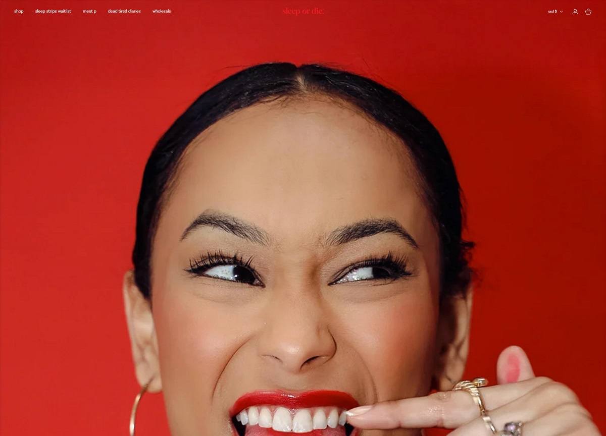 Sleep-or-die.com is a Shopify storefront centred on sleep accessories, led by its “Sleep Tape” (mouth tape) and a few bedside add-ons like a Sleep Case tin and “lights out” matches. The website design is bold and minimalist, with oversized, punchy copy (“it’s time to tape up”), high-contrast product imagery, and a very short path from landing page to “buy now.” It also blends commerce with brand-world pages (diary-style blog, “meet P,” wholesale) while keeping navigation simple and mobile-first.