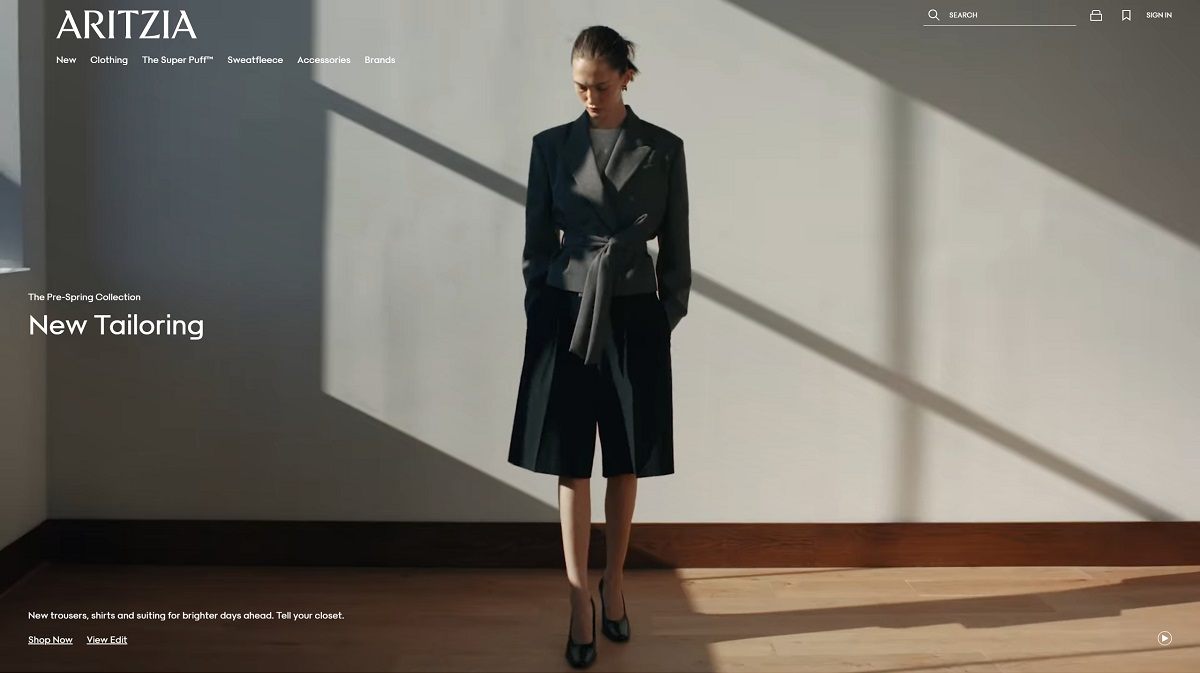 Aritzia is a women’s fashion retailer selling apparel and accessories across categories like activewear, blazers, dresses, jackets and coats, denim, knitwear, and pants, with in-house labels such as Wilfred, Babaton, and Tna alongside select third-party brands. The website design is clean and editorial, built around large product imagery and simple category-led navigation that gets visitors into product listings quickly.