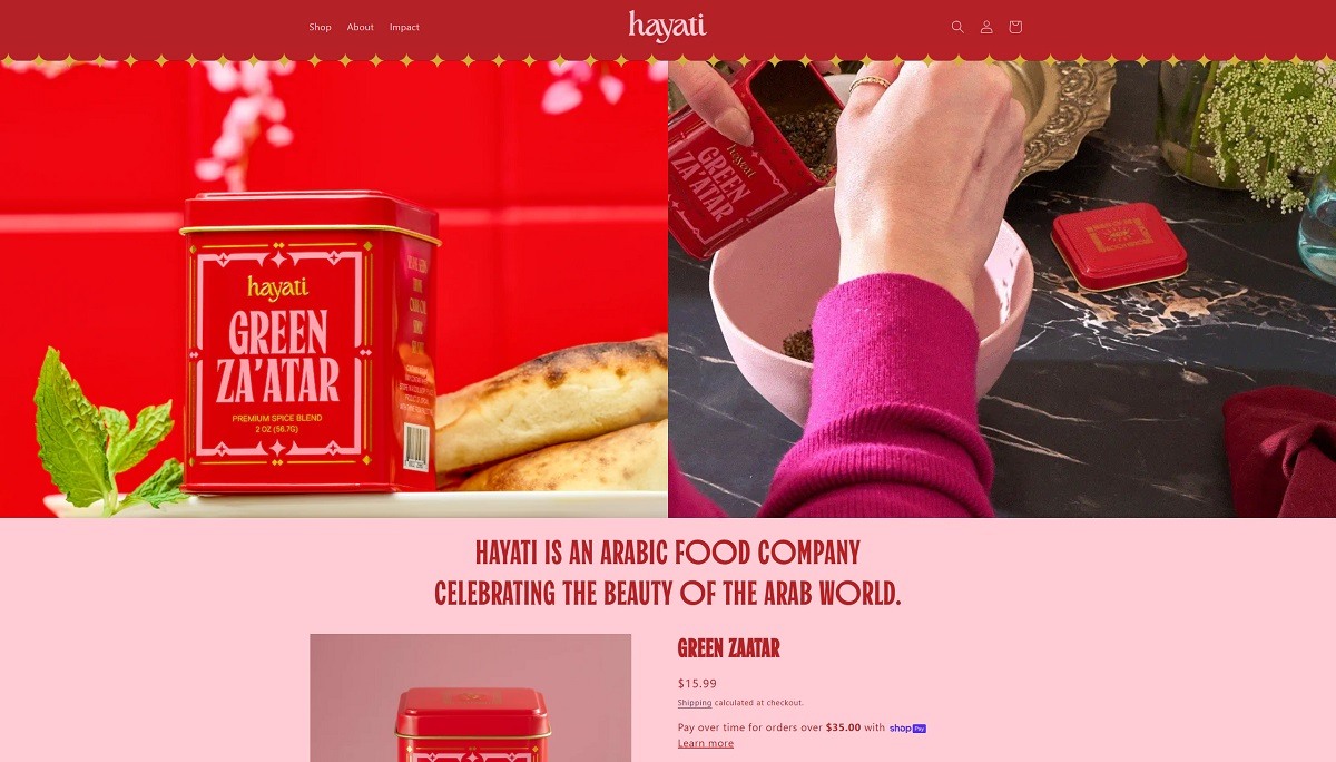 Hayati Goods sells premium Palestinian za’atar, a traditional Arabic spice blend of thyme, sesame seeds and sumac, directly from a Palestinian producer. The website design is clean and food-focused, with a simple navigation bar, large product imagery, and straightforward sections that guide visitors from cultural context into the single core product offering.