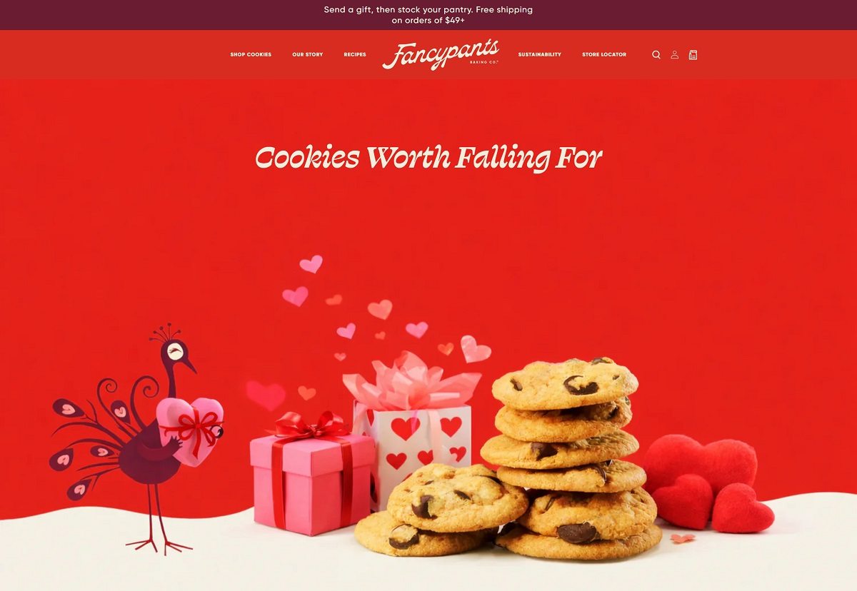 Fancypants Baking Co. sells packaged, crispy cookies in multiple flavours (like chocolate chip, salted caramel, birthday cake, and ginger snap), plus variety packs and bundles. The website design is bright and product-forward, with large pack photography, punchy headlines, and a simple shop flow that quickly routes visitors into the main cookie collections and best sellers.