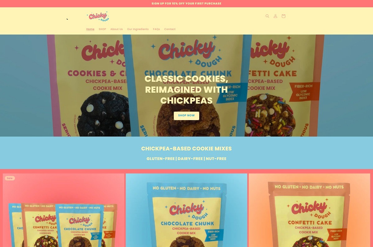 Eatchicky has a bright, modern website with a clean, playful design that makes the products feel fun and approachable. It focuses on chickpea-based cookie mixes, with allergy-friendly options and colourful baking products presented in a simple, easy-to-shop layout.