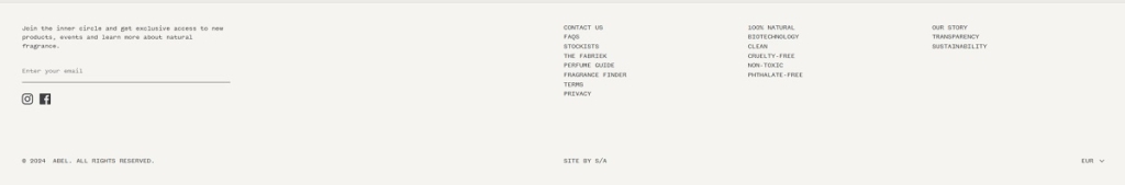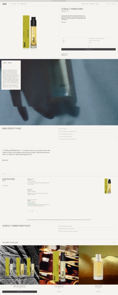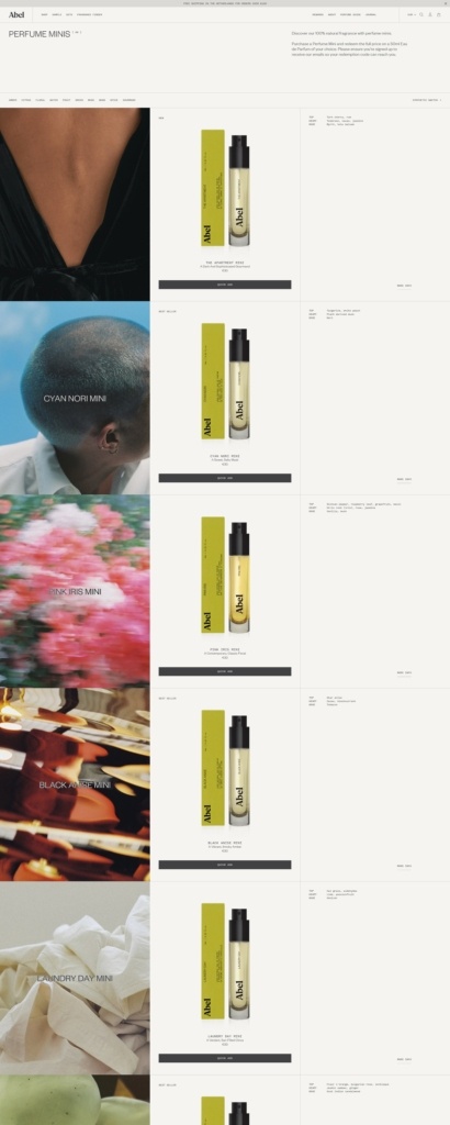 Abel’s website is crisp and modern, blending refined imagery with clean typography to communicate its ethos of natural luxury. Their product line features 100 % natural perfumes, room sprays, minis and curated sets—each crafted without petrochemicals and rooted in biotechnology