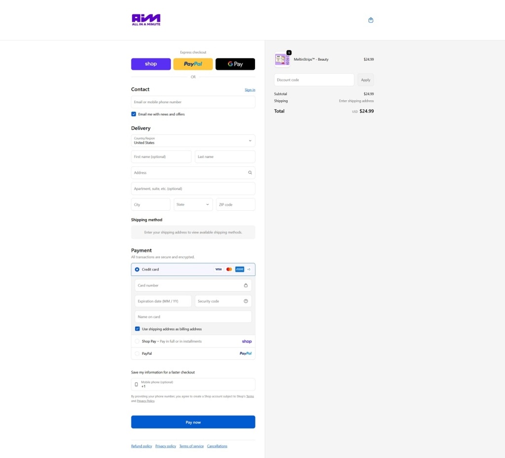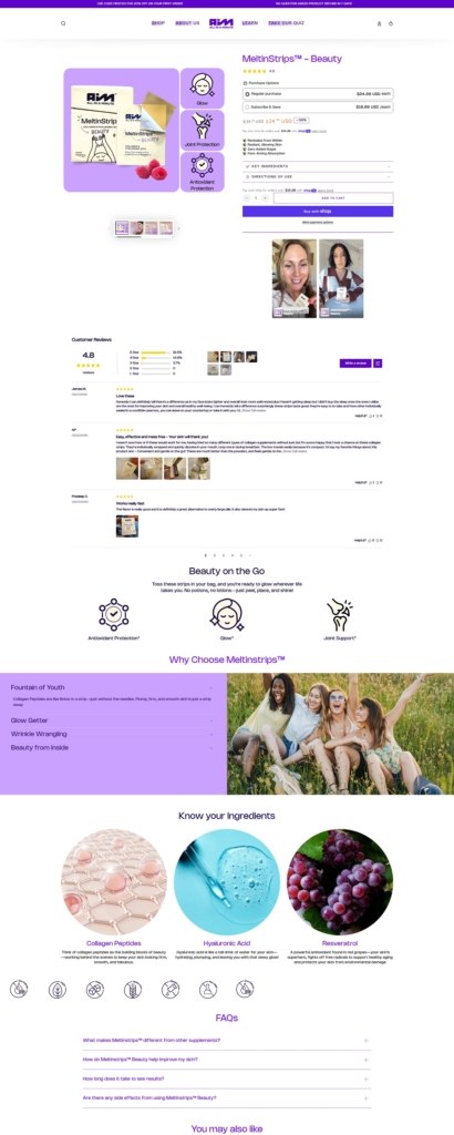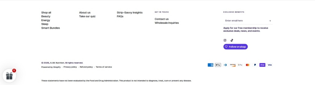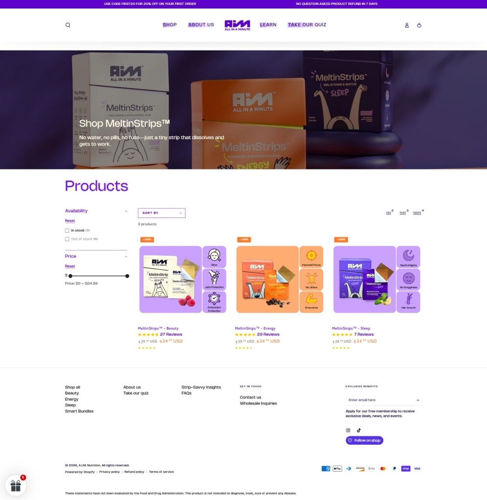 AIM Nutrition has a clean, modern ecommerce website with bold visuals and simple navigation, focused on showcasing its innovative supplement format. The design is product-first, with clear sections highlighting benefits like energy, sleep, and beauty. Its core products are MeltinStrips™, vegan, sugar-free oral strips that dissolve on the tongue for fast, convenient nutrient delivery. The brand positions itself as a portable, easy alternative to traditional pills and powders.
