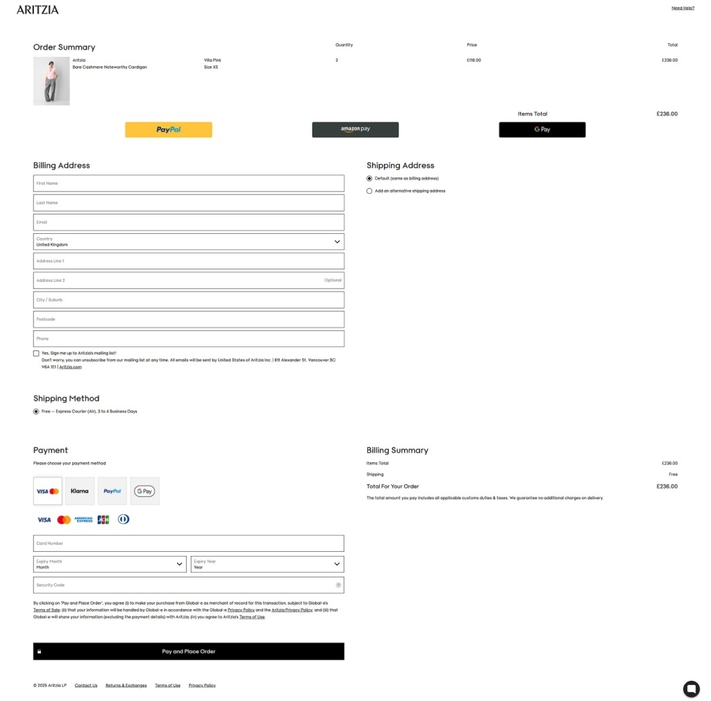 Aritzia Checkout Page Example