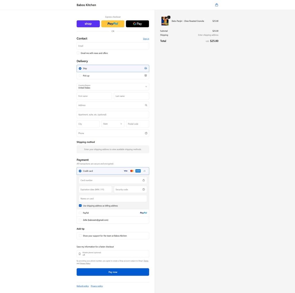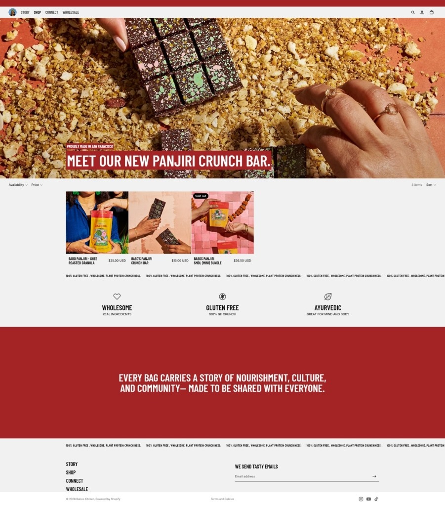 Babo’s Kitchen offers gluten-free Panjiri granola and related snacks like Panjiri crunch bars and mini bundles, rooted in traditional recipes and wholesome, real ingredients. The website design is clean and simple, with large product visuals, straightforward top navigation, and a shop-first layout that guides visitors from heritage and brand context into product pages.