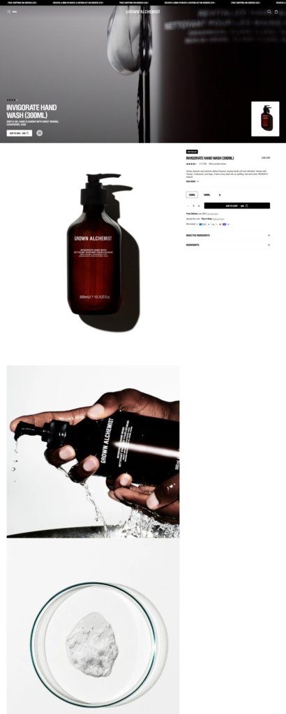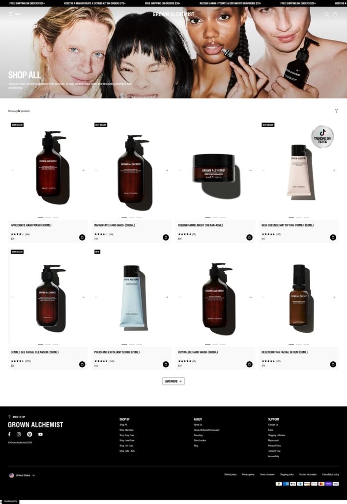 Grown Alchemist is a premium beauty brand selling skincare, haircare, body care, and hand care products, alongside gift sets and kits. The website design is minimalist and high-end, using clean typography, generous whitespace, and large product photography. Navigation is category-led and shop-forward, making it easy to browse collections and move from discovery to product pages.