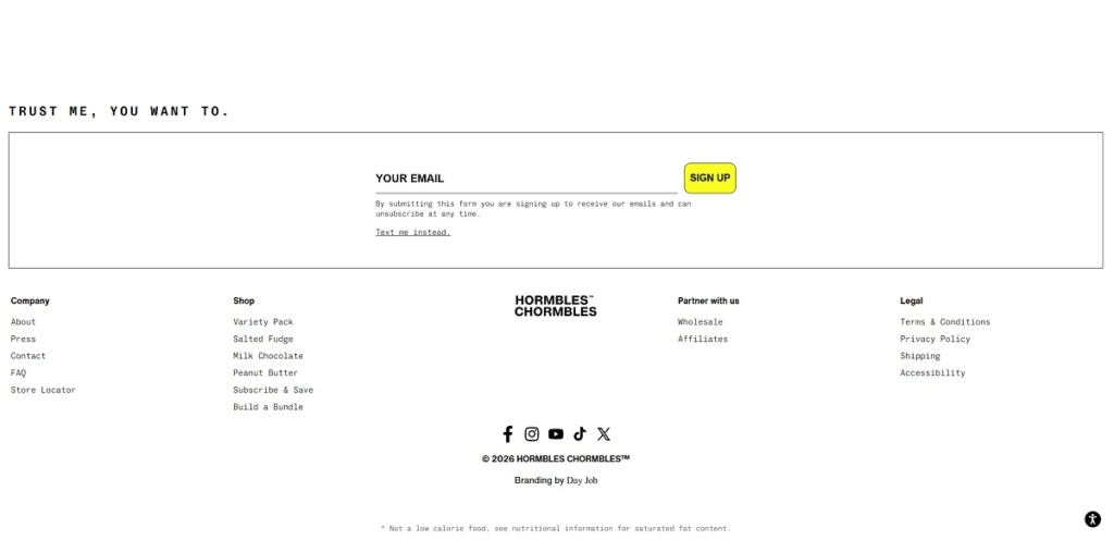 Hormbles sells “Chormbles” protein candy bars—chocolate-style bars positioned as candy with added protein and zero sugar, available in flavours like Salted Fudge, Milk Chocolate, Peanut Butter, and Cookies & Creme. The website uses a clean, modern e-commerce layout with bold product imagery, playful copy, and simple pathways to shop single flavours, build bundles, or subscribe.