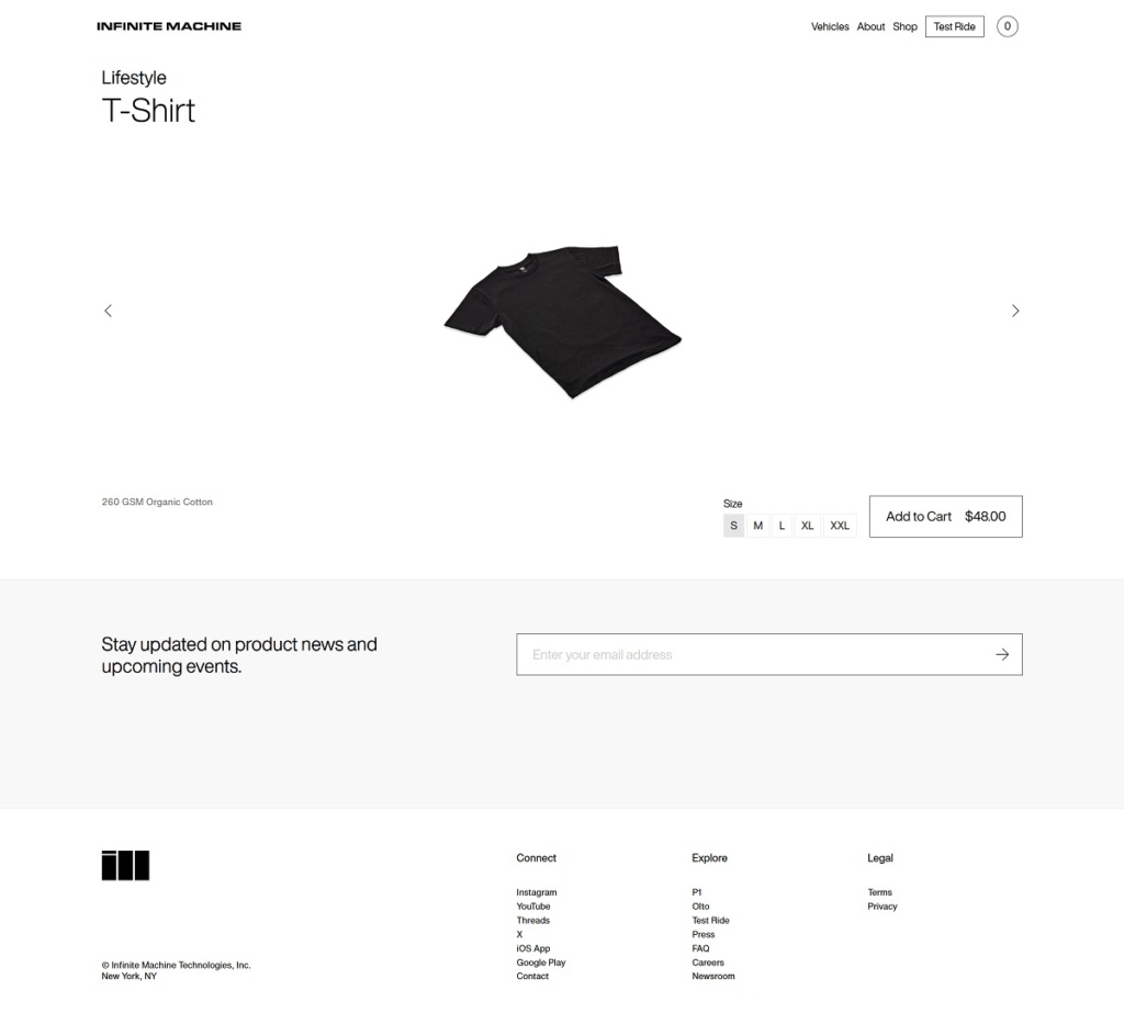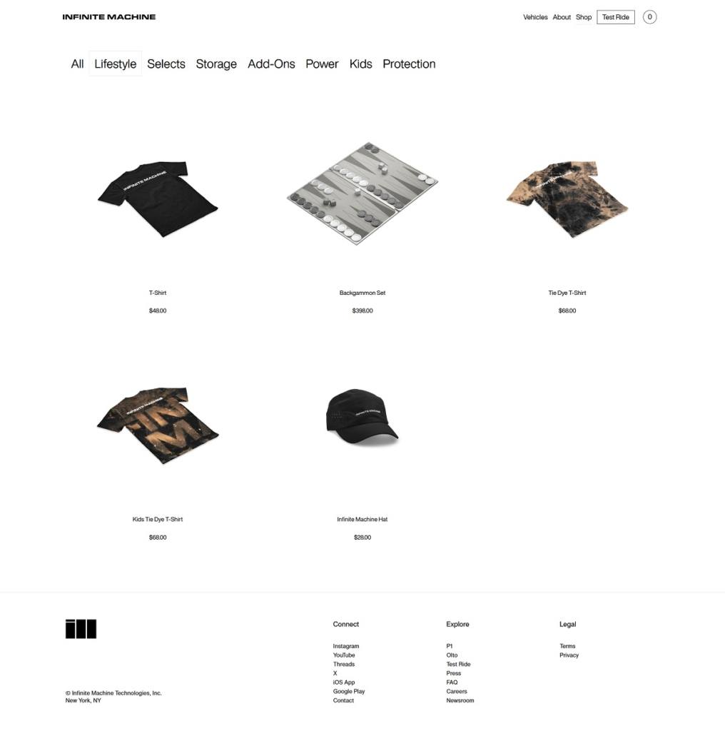Infinite Machine has a bold, futuristic ecommerce website with a dark, minimal design, cinematic visuals, and strong product storytelling. The layout feels premium and immersive, focusing on design, performance, and technology through large renders and smooth sections. The brand offers high-performance electric vehicles like the P1 scooter and Olto, designed for urban mobility as alternatives to cars. Products feature removable batteries, app connectivity, security systems, and modular accessories. Overall, the site positions the brand as a cutting-edge, design-led player in next-gen personal transport.