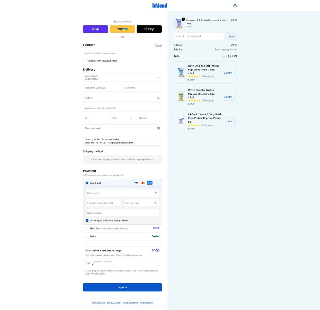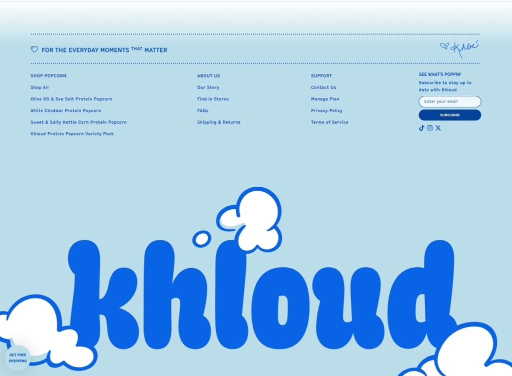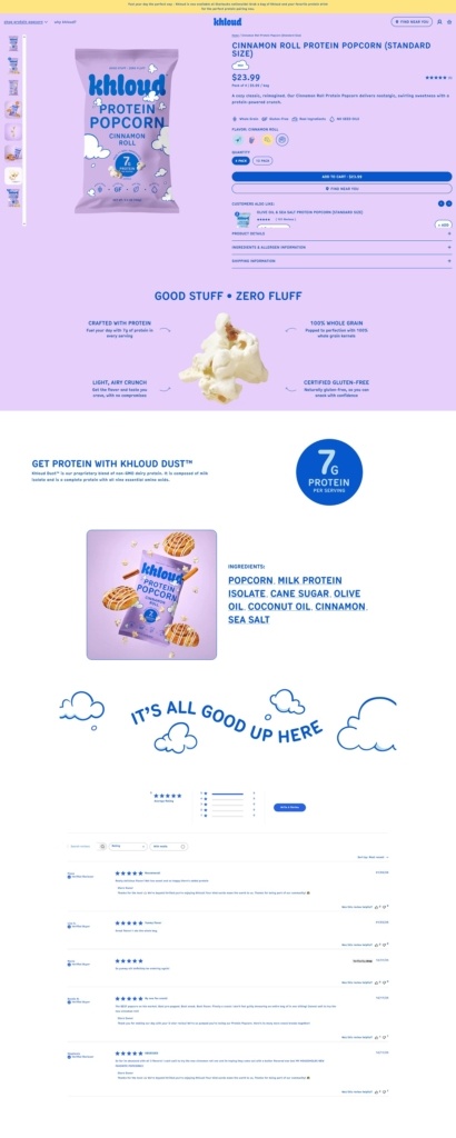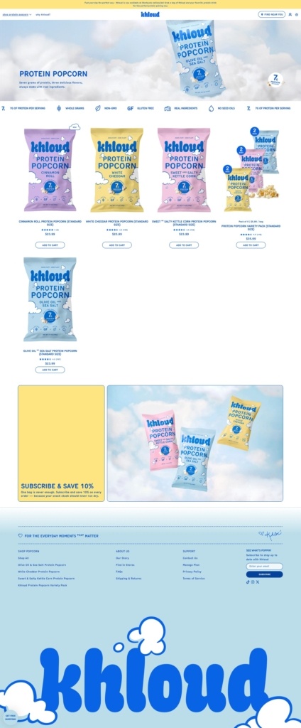 Khloudfoods.com is the storefront for Khloud (by Khloé Kardashian), selling protein popcorn in flavours like Cinnamon Roll, White Cheddar, Sweet & Salty Kettle Corn, and Olive Oil & Sea Salt, plus a variety pack and a “Subscribe & Save” option. The product is positioned around “real ingredients,” “no seed oils,” and 7g of complete protein per serving (using milk protein isolate). The website design is bold and modern, with oversized hero headlines, clean shop-first navigation, and benefit icons that make the value props easy to scan.