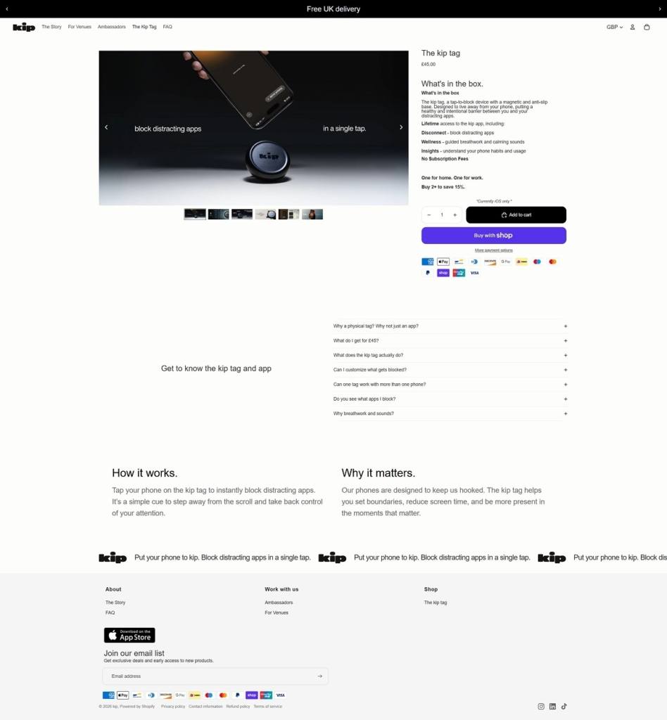 Kip Life is a sleep-focused wellness brand with a clean, minimal ecommerce website that uses calm colours, simple layouts, and soft visuals to promote relaxation and better nighttime routines. The design is distraction-free, mirroring its core message of reducing digital noise and improving sleep habits. The brand’s main products include a “Disconnect Tag” device that blocks distracting apps and a companion mobile app offering sleep guidance, breathing exercises, and soundscapes.
