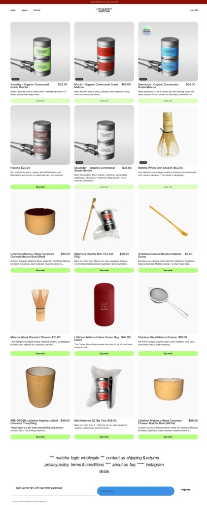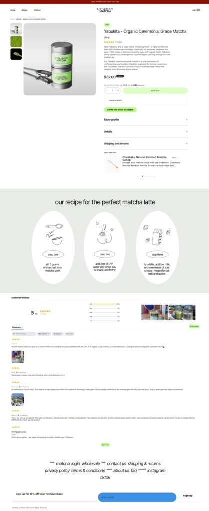 Littlefoot Matcha offers organic, ceremonial-grade matcha and related tea accessories sourced from small farms in Shizuoka, Japan — a line crafted to bring high-quality matcha and tea rituals into everyday life. Their website features a clean, minimalist design with generous white space, clear navigation, and striking product photography that invites you into a calm and refined browsing experience.