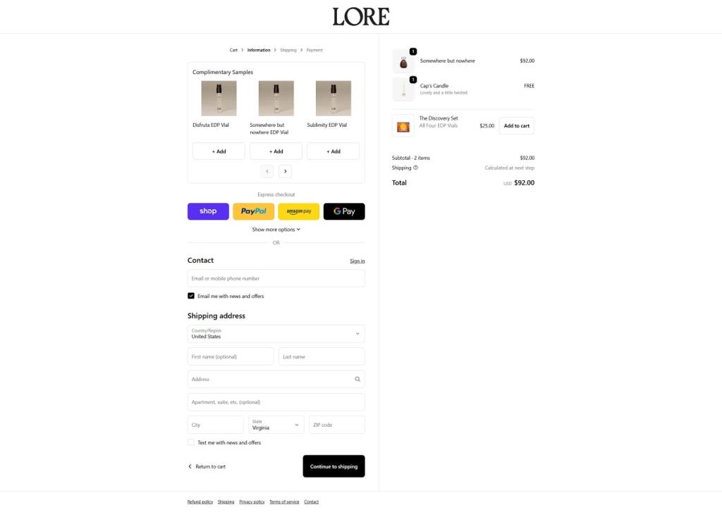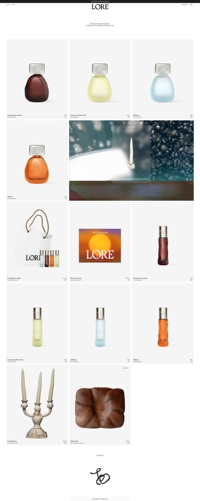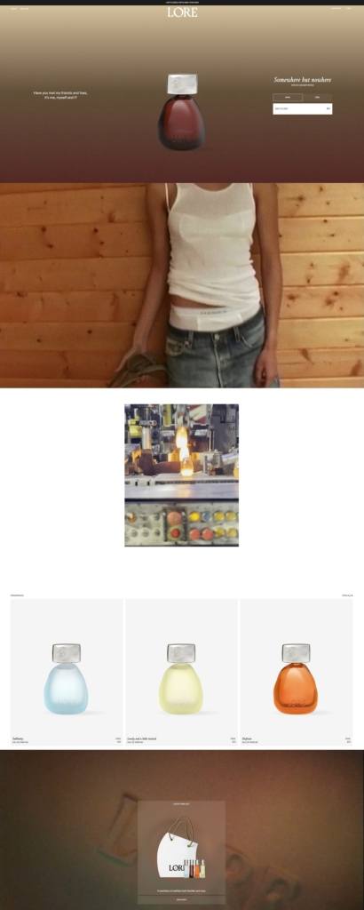 Lore is a modern fragrance brand with a sleek, editorial-style ecommerce website that uses minimalist layouts, poetic copy, and immersive visuals to present its perfumes as sensory storytelling experiences. The site highlights a small collection of design-forward eau de parfums, each crafted to evoke specific places, moods, or memories through layered scent compositions. Products are displayed in sculptural glass bottles with artistic photography, positioning the brand as a luxury fragrance label focused on emotion, narrative, and experiential scent design.