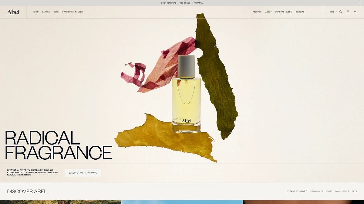 Abel’s website is crisp and modern, blending refined imagery with clean typography to communicate its ethos of natural luxury. Their product line features 100 % natural perfumes, room sprays, minis and curated sets—each crafted without petrochemicals and rooted in biotechnology