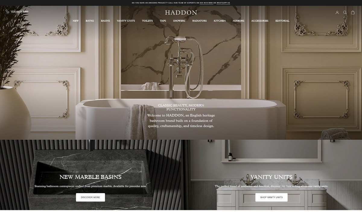 Haddon’s website blends elegance with clarity: spacious layouts, refined typography, and rich imagery highlight their craftsmanship and luxury aesthetic. Their product lineup is focused on premium bathroom fixtures — freestanding and stone baths, marble basins, vanity units, taps, showers, mirrors, and related accessories — all positioned as beautifully designed, functional centrepieces.