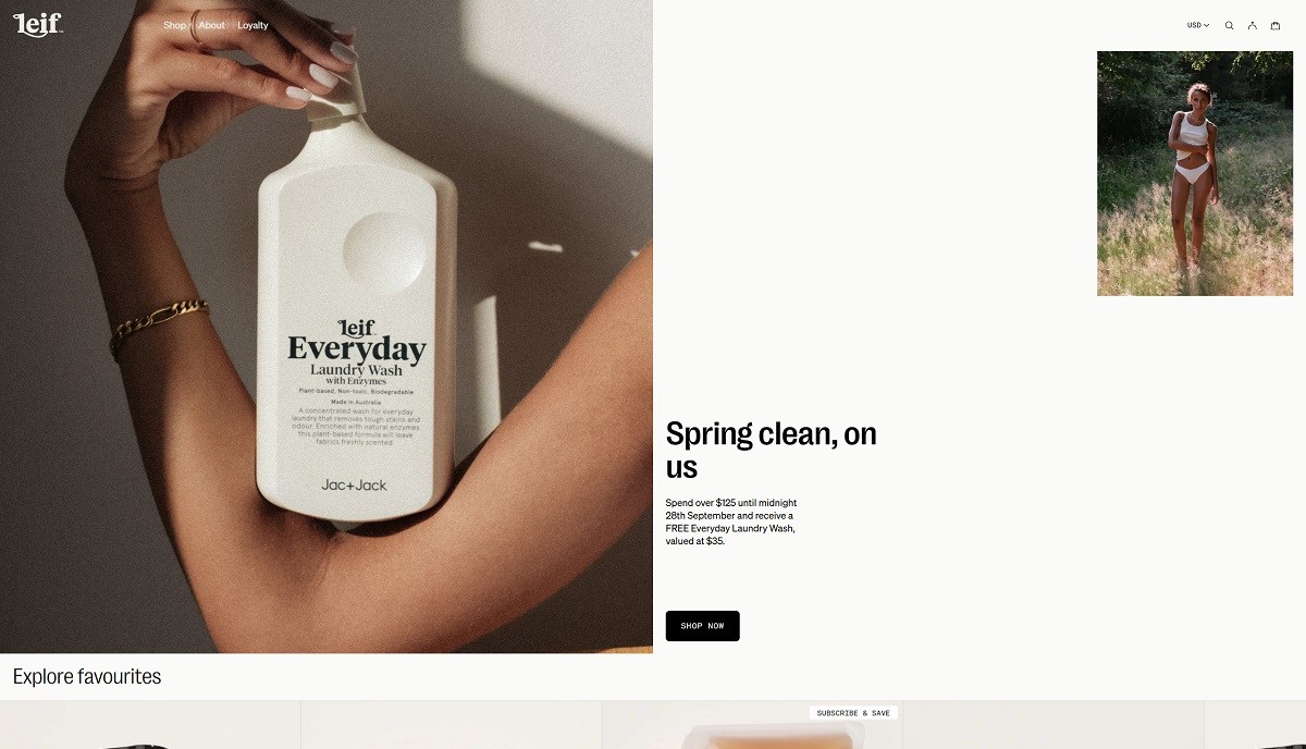 Leif’s site is clean, inviting, and thoughtfully organized, with bold imagery and soft, natural colour palettes that echo its brand ethos. They offer a curated range of skincare, haircare, body care, home products and eco-friendly refill options, all built around plant-based, cruelty-free formulations. The design emphasizes ease of shopping—clear collections, scent filters, bundles, and loyalty/refill programs—all framed in a sustainable, modern aesthetic.