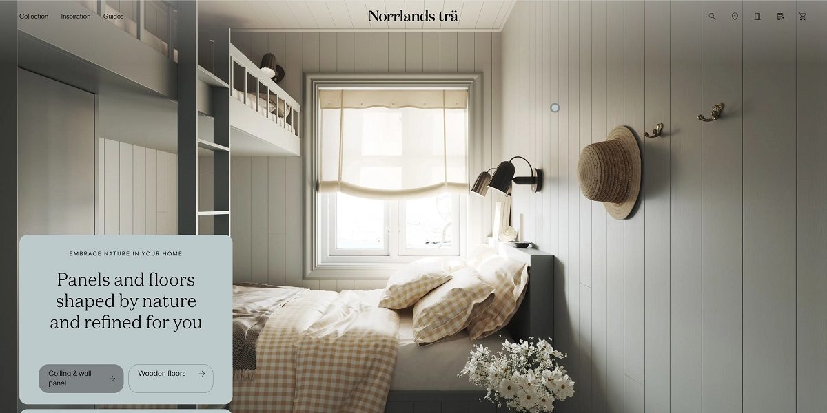 Norrlands Trä’s site is earthy and modern, with generous spacing, clean typography, and immersive photography that evoke the natural beauty of wood. Their product offering centers on wood panels and wooden flooring, emphasizing craftsmanship, sustainability, and the material’s inherent textures. The site also weaves in inspiration, guides, and transparency around product attributes to help users make informed design decisions.