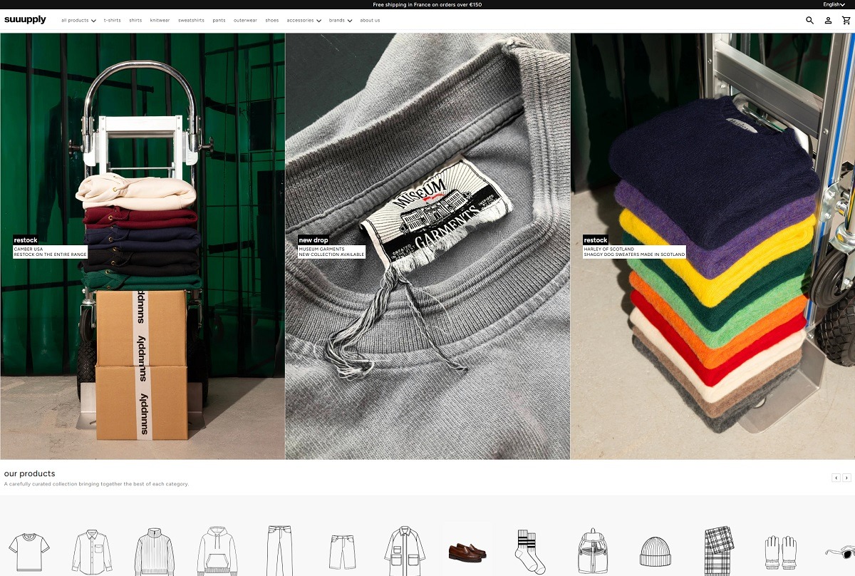 Suuupply’s website is clean, curated, and modern, with a refined aesthetic and intuitive navigation of menswear essentials. They carry a selective range of high-quality clothing and accessories — heavyweight tees, workwear pants, outerwear, and carefully chosen brands — positioning themselves as a destination for “essentials for the quality-obsessed.”
