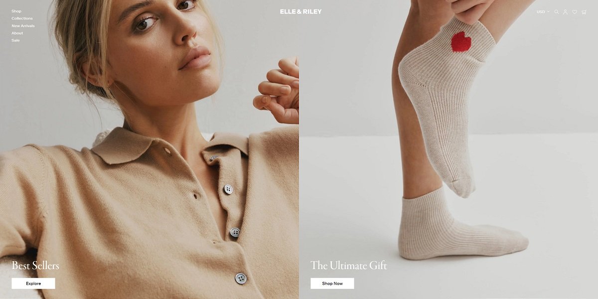 Elle & Riley’s website is elegant and refined, with airy layouts, soft color tones, and high-quality imagery that underscore their commitment to luxury knitwear. Their product catalog revolves around cashmere staples — cardigans, sweaters, loungewear, accessories, and cashmere care items — all positioned as timeless, ethically sourced pieces.