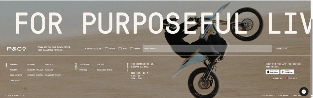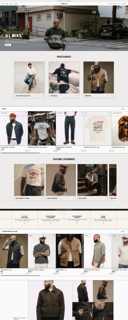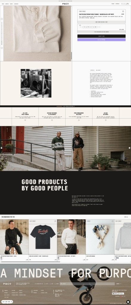 P&Co’s website blends rugged style with clean structure: bold hero visuals, crisp typography, and well-segmented categories for menswear, womenswear, and goods. Their product line includes curated streetwear staples — heavy-weight tees, outerwear, denim, knitwear, headwear, and leather goods — built with emphasis on craftsmanship and timeless design.