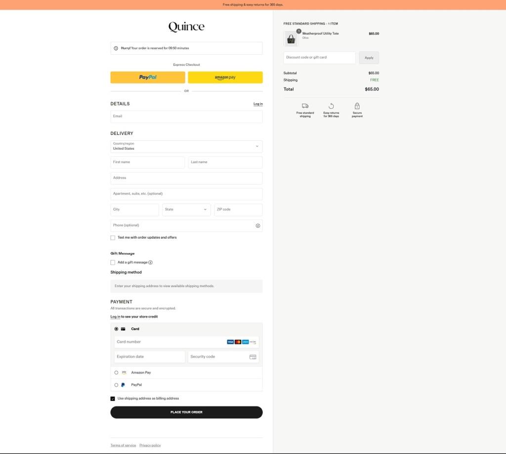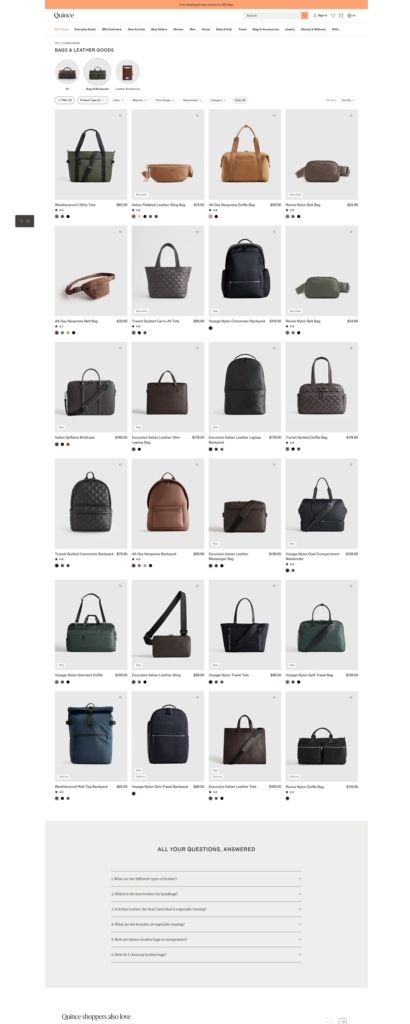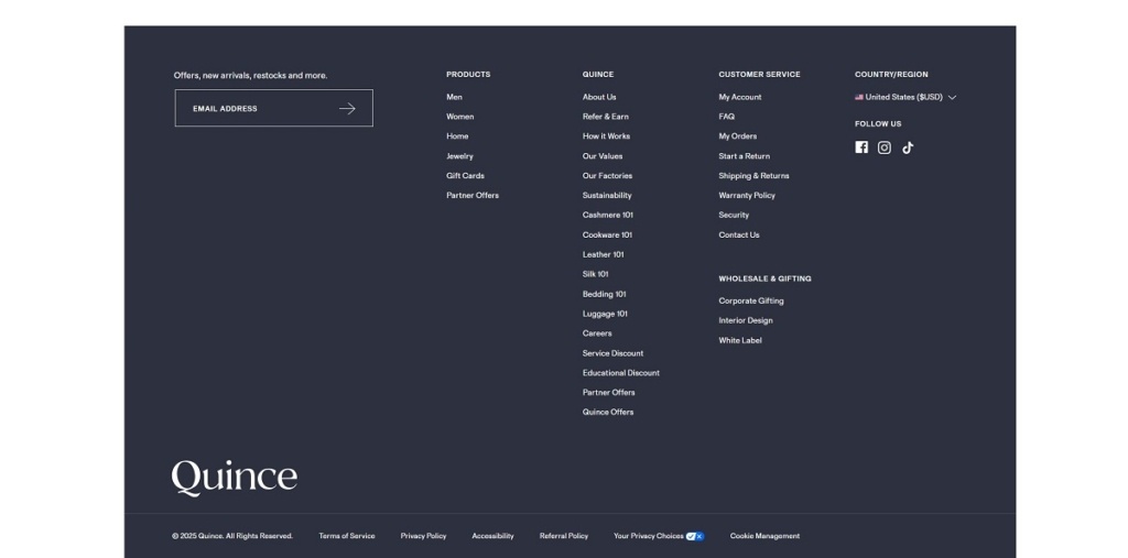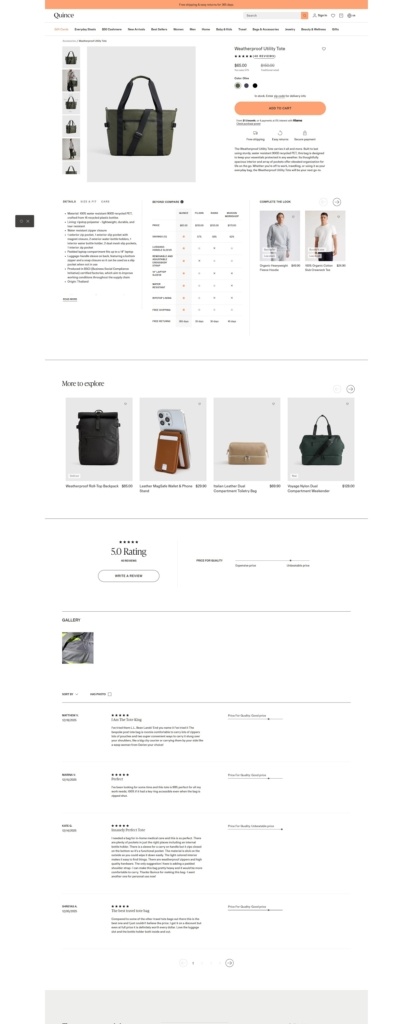 Quince offers a wide range of affordable, high-quality essentials — from clothing and cashmere to home goods, accessories, and beauty — emphasising simple, timeless design. Their website features a clean, minimalist layout with large product photography, intuitive filters, and straightforward navigation that makes browsing effortless.