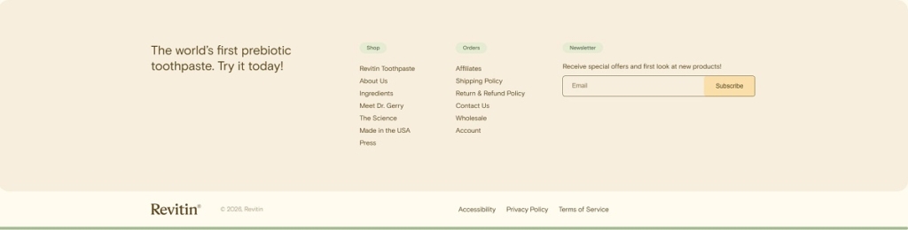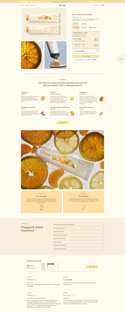 Revitin is a natural oral-care brand with a clean, modern ecommerce website that focuses on education and simple product presentation. The site highlights its flagship prebiotic toothpaste, designed to support the oral microbiome using natural ingredients, vitamins, antioxidants, and plant-based nutrients rather than harsh chemicals. Products are presented in mint and citrus variations, with messaging centered on fluoride-free, SLS-free, and microbiome-supporting formulas that promote healthy gums, fresher breath, and balanced oral health.