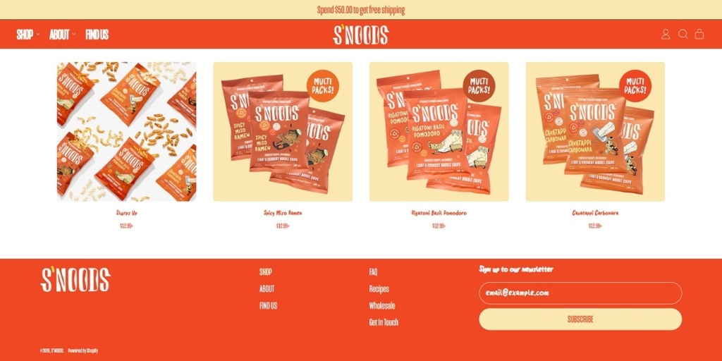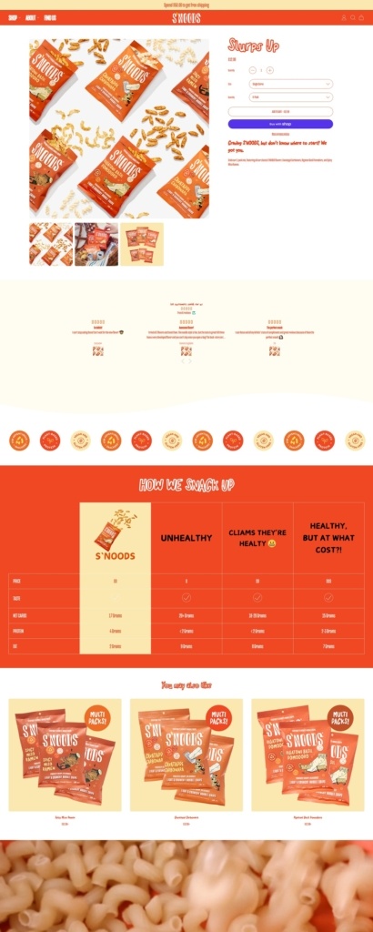 Eatsnoods.com is the ecommerce site for S’NOODS, a snack brand selling “noodle chips” in globally inspired flavours such as Spicy Miso Ramen, Rigatoni Basil Pomodoro, and Cavatappi Carbonara, alongside variety packs and seasonal drops. The website design is bold and playful, with large typography, punchy copy, and a simple top navigation that funnels quickly into Shop, About, and Find Us. It also supports retail discovery with a dedicated store locator while keeping the shopping experience clean and Shopify-native.