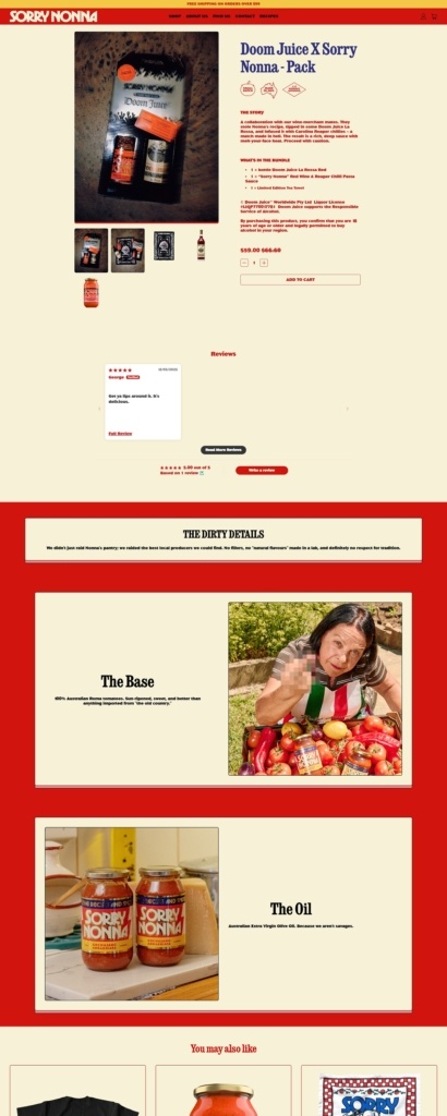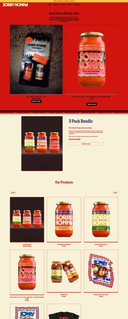Sorry Nonna is a pasta and pantry brand selling dry pasta shapes along with complementary items like sauces and pantry bundles. The website design is clean and product-forward, with large food photography, simple category navigation, and clear calls to action that guide visitors into featured products and collections. Key product pages pair visuals with concise descriptions and ingredient highlights to support quick evaluation.