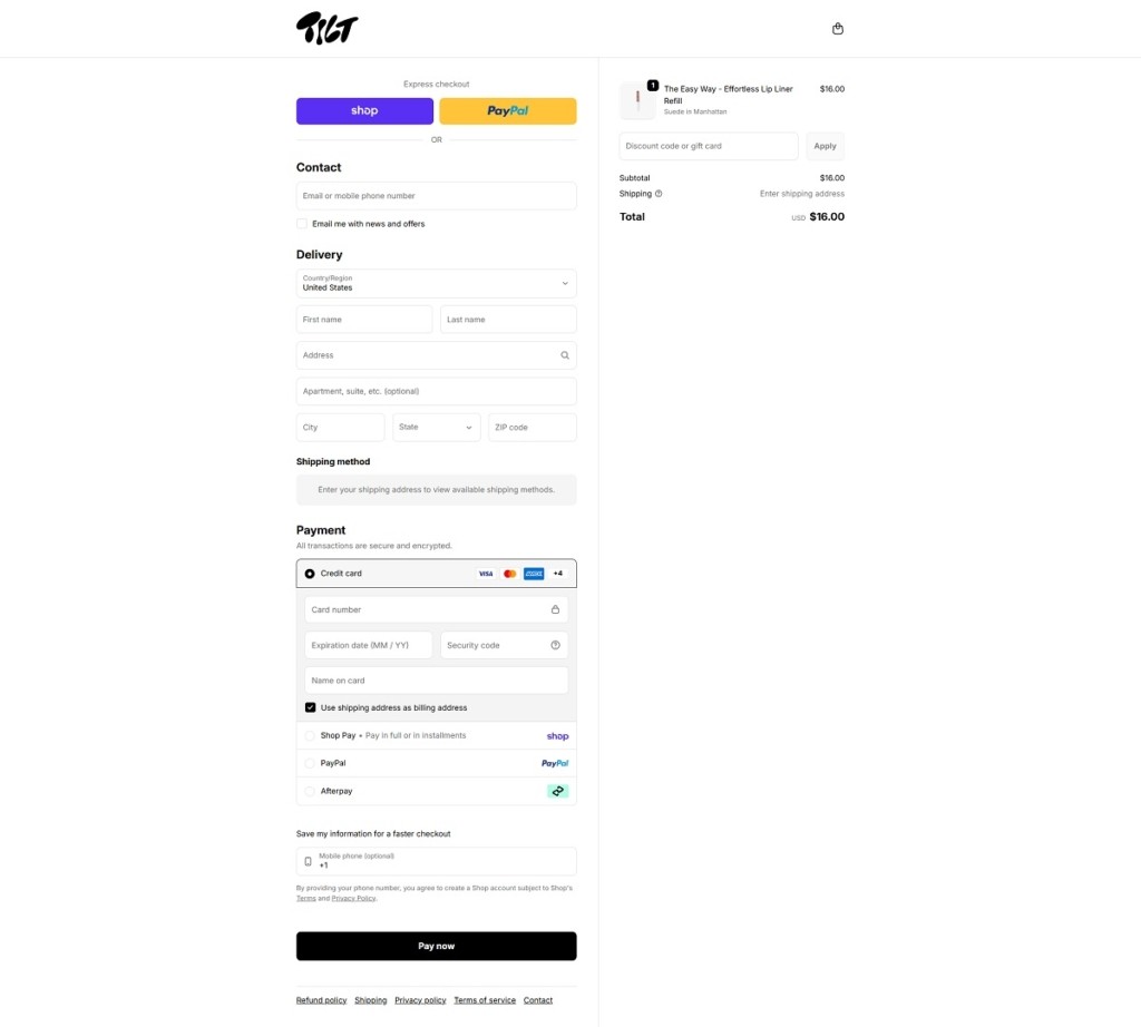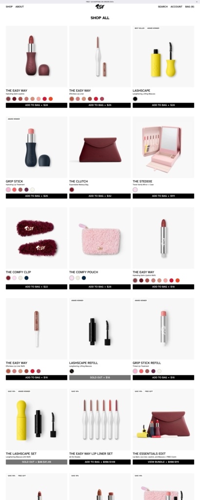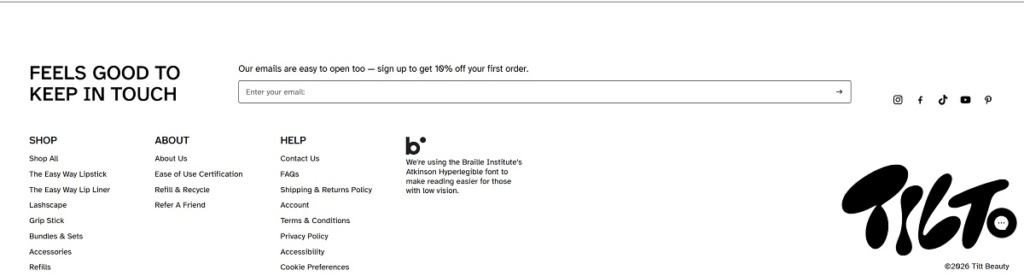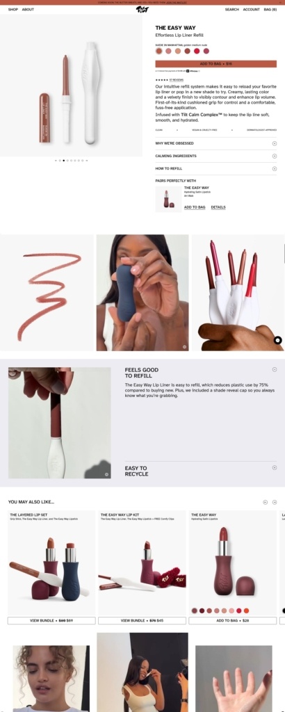 Tilt Beauty is an accessible makeup brand offering ergonomic, refillable cosmetics like Lashscape mascara, hydrating lip treatments, satin lipstick, and effortless lip liners designed to be easier to hold, open, and apply. The website design is clean and product-focused, with large product imagery, clear top navigation into core collections, and prominent calls to action that lead straight into featured products and bundles.
