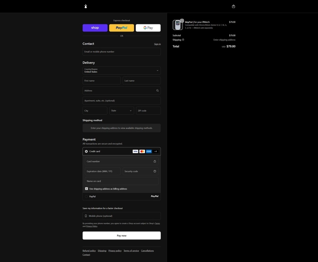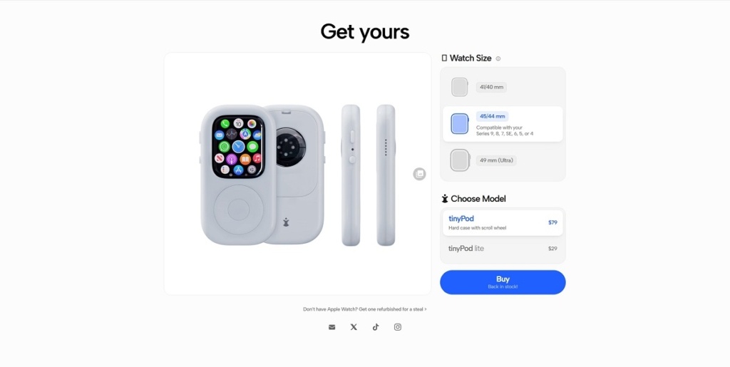 TinyPod offers hardware accessories that turn an Apple Watch into a pocket-friendly device with a physical scroll wheel case and a lighter silicone-style case, designed to let the watch feel more like a compact music player or communicator. The product range is small, focused on these two TinyPod variants sized for different Apple Watch models. The website design is tech-oriented and feature-driven, using large visuals, product shots showing functionality with an Apple Watch, and clear sections highlighting how the product works and its benefits.