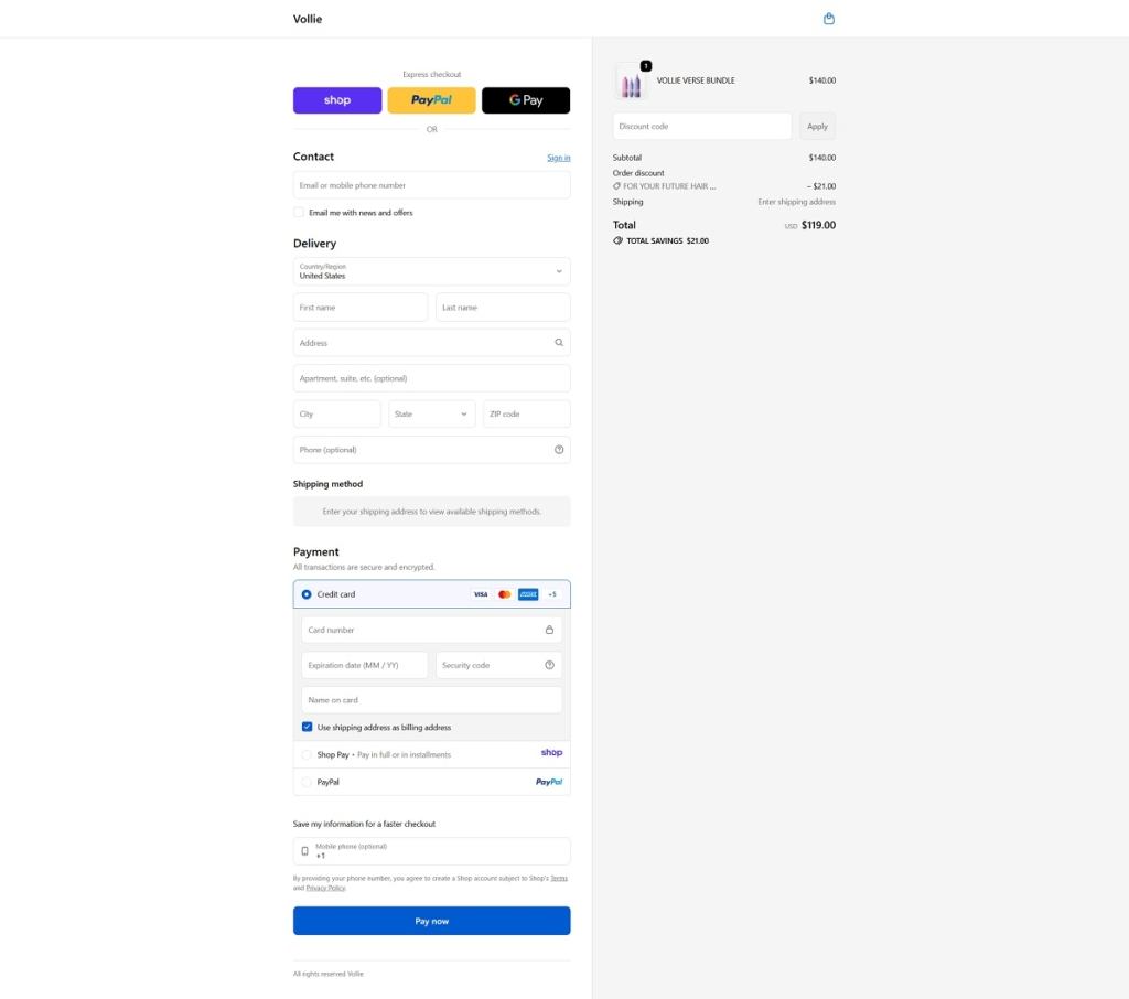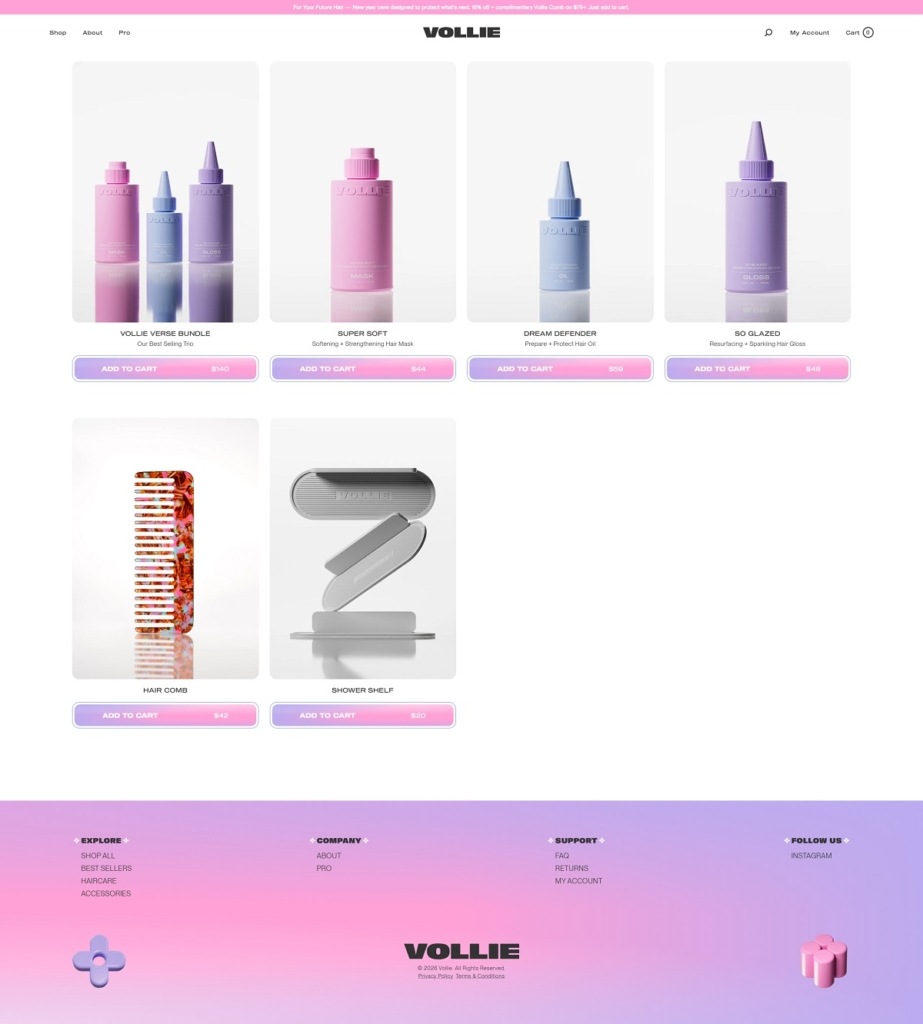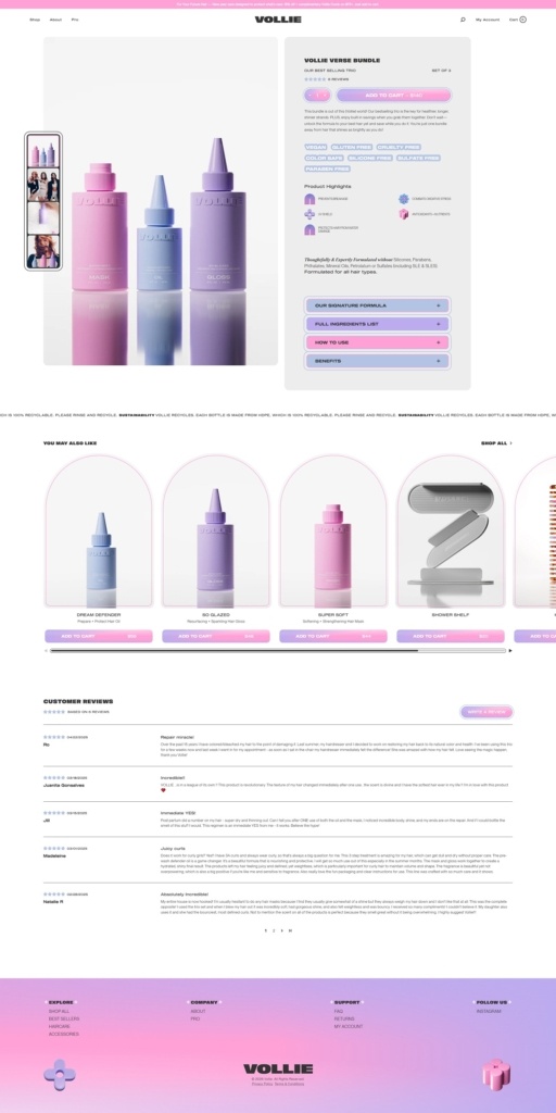 Vollie is a salon-inspired haircare brand selling a small, curated lineup focused on treatment and shine, including a softening and strengthening hair mask, a pre-water protective hair oil, and a resurfacing hair gloss, plus bundles and a few accessories. The website design is clean and premium, built around bold headlines, generous whitespace, and large product and lifestyle visuals that keep the shopping path simple. It leans on benefit-led callouts and ingredient highlights within product pages to make the value props easy to scan without feeling crowded.