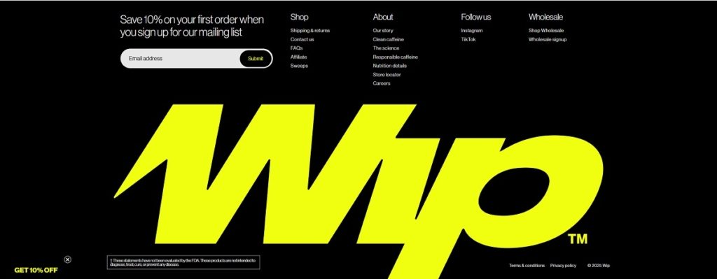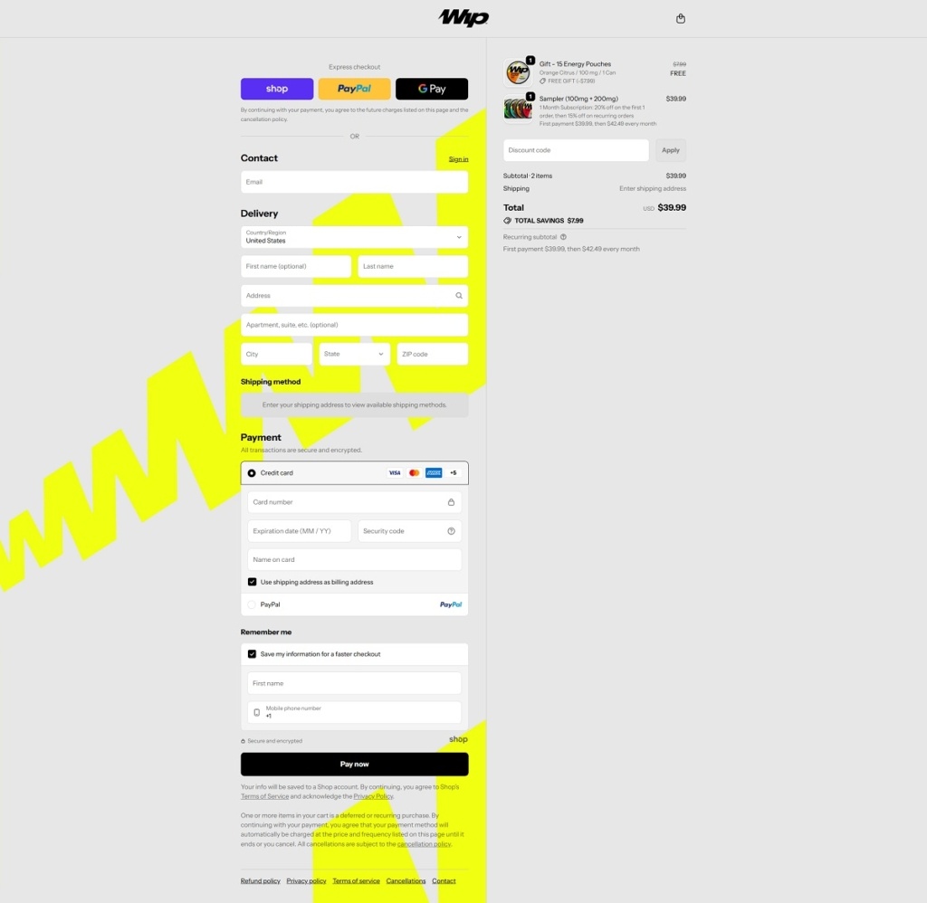 Wip.com is an ecommerce site for Wip energy pouches, selling natural-caffeine pouches in flavours like Sour Cherry and Strawberry Kiwi, plus sampler packs and multi-pack bundles. The website design is bold and minimalist, with an oversized hero headline, quick “Shop pouches” calls to action, and a homepage that jumps straight into flavour tiles and product cards. It also includes education and discovery pages while keeping navigation tight and commerce-first.
