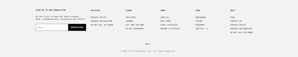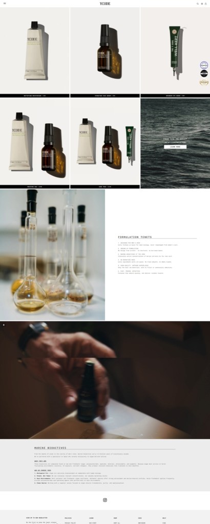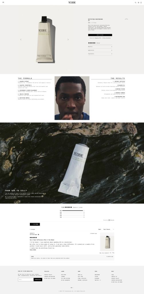 YCODE is a men’s skincare brand selling a small lineup of face products, including an advanced eye serum, hydrating face serum, and mattifying moisturiser, positioned around “marine bioactives” and formulas designed specifically for men’s skin. The website design is minimalist and product-led, using bold hero messaging, large imagery, and a simple top navigation (Shop, Journal, About, Stockists) that moves visitors quickly into featured products.